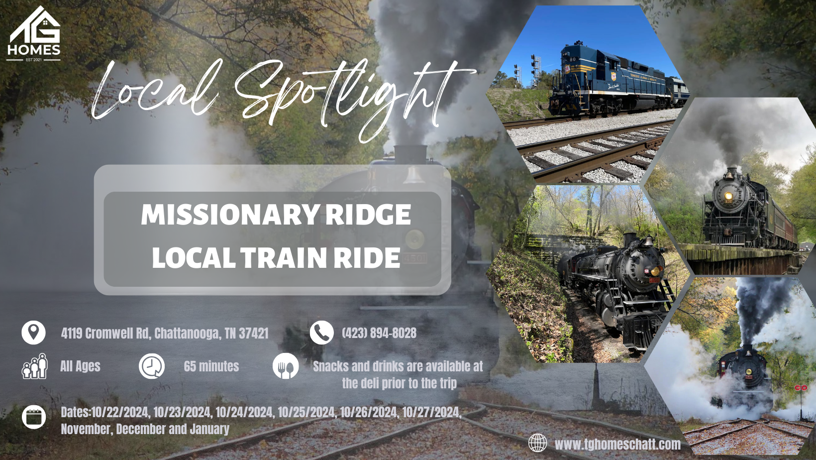 Join us for an unforgettable adventure departing from our charming station at 4119 Cromwell Road. Our train rides, perfect for families and friends, take you on scenic routes through North Georgia, including delightful stops at Chickamauga and Summerville.